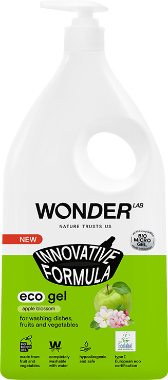 Hypoallergenic Dishwashing Eco gel with aroma of juicy apple blossom effectively and easily removes grease and food scraps. Leaves no odour and streaks; makes any surface shine. Equally effective in cold and hot water. The gel is efficiently consumed and foams well due to it’s texture. Eco gel also perfectly washes off surface preservatives and contaminants from fruit and vegetables. It is completely washable with water in just few seconds and is totally safe for all family members, nature, and septic tanks. Formula is PH neutral and doesn’t irritate sensitive skin.