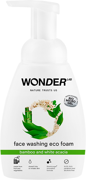 Face wash Eco foam WONDER LAB with fragrance of bamboo and white acacia gently and delicately cleanses the face skin, maintaining the natural pH balance. Product is ready to use and doesn't require water dilution. Foam is suitable as make-up remover. Pleasant aroma of bamboo and white acacia refreshes and purifies your skin. Method of use: small amount of foam apply to a wet face and neck skin without additional water. Massage lightly with fingertips and rinse off. The product is not tested on animals. Due to the innovative component Biomicrogel® made from fruit and vegetables, WONDER LAB products are safe for use, don't contain harmful substances, don't damage environment and decompose by 98% in 1 day.