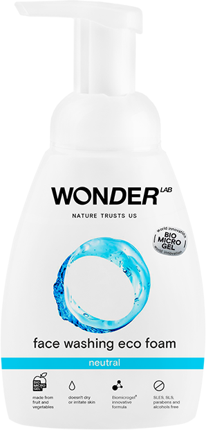 Face wash Eco foam WONDER LAB with neutral fragrance gently and delicately cleanses the face skin, maintaining the natural pH balance. Product is readty to use and doesn’t require water dilution. Doesn’t contain SLS, SLES, sulfates, parabens, suitable for sensitive skin. Method of use: small amount of foam apply to a wet face and neck skin without additional water. Massage lightly with fingertips and rinse off. The product is not tested on animals. Due to the innovative component Biomicrogel® made from fruit and vegetables, WONDER LAB products are safe for use, don’t contain harmful substances, don’t damage environment and decompose by 98% in 1 day.