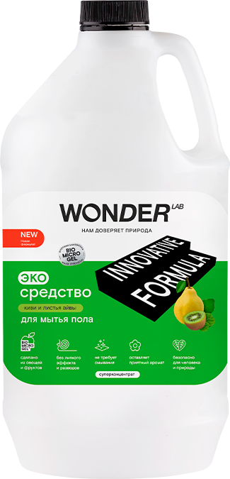 Floor Detergent WONDER LAB with fresh fragrance kiwi and quince leaves has concentrated formula for efficient consumption. Eco floor detergent is sutable for all floor covering types: laminate, linoleum, ceramic tiles, marble and parquet. Detergent leaves pleasant fragrance, no need to wash off, leaves no film or streaks. Removes static electricity and hasn't sticky effect. Formulation is safe and effective for all family members and pets.