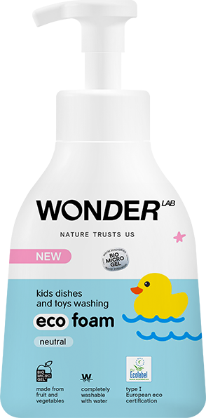 WONDER LAB eco foam is specially designed for washing baby dishes, pacifiers and toys. Effective in hot and cold water. The product is safe for babies, has a neutral PH and is completely washable with water in a few seconds. Allows to reduce water consumption and to be sure that the remains of the product won’t penetrate into the child’s organism. No more worries if your child wants to do the dishes by themselves. The foam is quickly washed off the surface, the dishes don’t need to be rubbed. Doesn’t dry or irritate skin. Cost-efficient: 2.5 lower consumption compared to conventional gels.