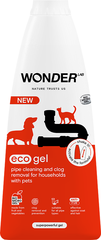 Gel is suitable for clogs caused by animal hair. This effective pipe cleaner not only removes pipe clogs but also cleans the pipe inner surface to prevent further clogs and contribute to the household hygiene. The Eco gel is thixotropic: very thick at rest, it becomes more liquid after shaking for better fixation and distribution across pipe walls. Quickly and effectively dissolves hair, food scraps, and other types of dirt.