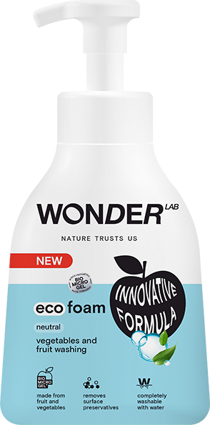 This safe and innovative WONDER LAB Eco foam is great for washing fruit, vegetables and berries, it perfectly washes off dirt, preservatives, wax, etc. Foam thoroughly cleanses the peel, doesn’t penetrate and is completely washable with water in just few seconds. Easily distributed, it removes all surface preservatives and dirt. Cost-efficient due to it’s convenient dispenser: 2.5 lower consumption compared to conventional liquid soap. Product is based on the innovative component Biomicrogel® made from fruit and vegetables. Thanks to this component all WONDER LAB products are safe for people, don’t damage environment, don’t contain toxic ingredients and decompose by 98% in 1 day.